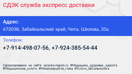 СДЭК, служба экспресс-доставки по адресу 672038, Забайкальский край, Чита, Шилова, 35а в дальнейшем Организация, размещена в следующих категориях: