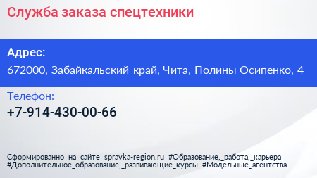 Служба заказа спецтехники по адресу 672000, Забайкальский край, Чита, Полины Осипенко, 4 в дальнейшем Организация, размещена в следующих категориях: