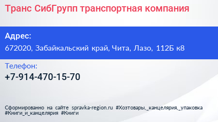 Транс-СибГрупп, транспортная компания по адресу 672020, Забайкальский край, Чита, Лазо, 112Б к8 в дальнейшем Организация, размещена в следующих категориях: