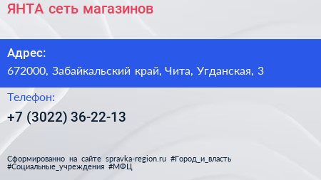 ЯНТА, сеть магазинов по адресу 672000, Забайкальский край, Чита, Угданская, 3 в дальнейшем Организация, размещена в следующих категориях: