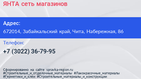 ЯНТА, сеть магазинов по адресу 672014, Забайкальский край, Чита, Набережная, 86 в дальнейшем Организация, размещена в следующих категориях: