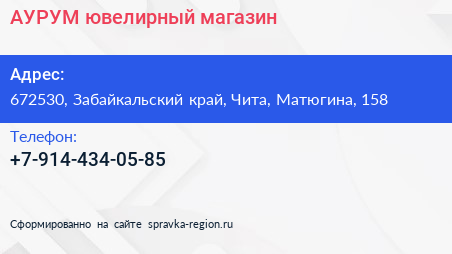АУРУМ, ювелирный магазин по адресу 672530, Забайкальский край, Чита, Матюгина, 158 в дальнейшем Организация, размещена в следующих категориях: