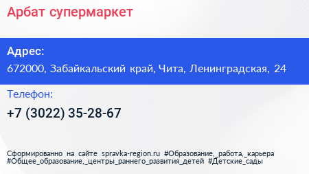 Арбат, супермаркет по адресу 672000, Забайкальский край, Чита, Ленинградская, 24 в дальнейшем Организация, размещена в следующих категориях: