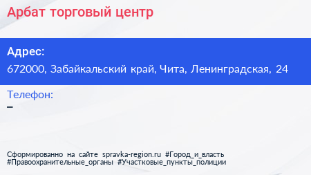 Арбат, торговый центр по адресу 672000, Забайкальский край, Чита, Ленинградская, 24 в дальнейшем Организация, размещена в следующих категориях: