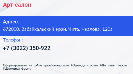 Арт-салон по адресу 672000, Забайкальский край, Чита, Чкалова, 120а в дальнейшем Организация, размещена в следующих категориях: