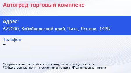 Автоград, торговый комплекс по адресу 672000, Забайкальский край, Чита, Ленина, 149Б в дальнейшем Организация, размещена в следующих категориях: