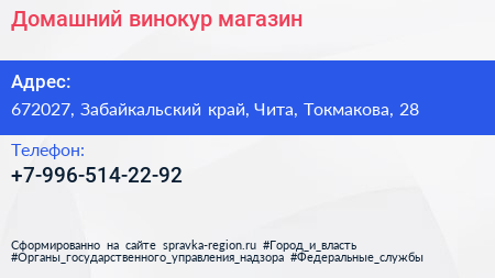 Домашний винокур, магазин по адресу 672027, Забайкальский край, Чита, Токмакова, 28 в дальнейшем Организация, размещена в следующих категориях: