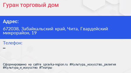 Гуран, торговый дом по адресу 672038, Забайкальский край, Чита, Гвардейский микрорайон, 19 в дальнейшем Организация, размещена в следующих категориях: