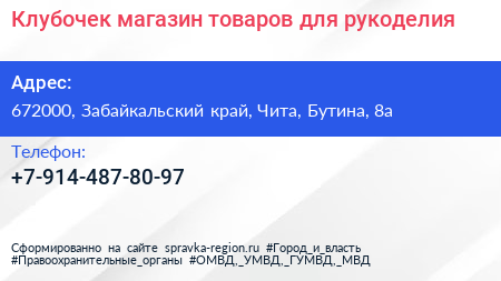 Клубочек, магазин товаров для рукоделия по адресу 672000, Забайкальский край, Чита, Бутина, 8а в дальнейшем Организация, размещена в следующих категориях: