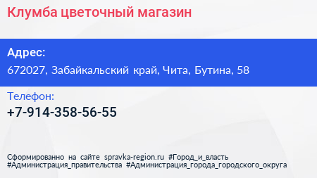 Клумба, цветочный магазин по адресу 672027, Забайкальский край, Чита, Бутина, 58 в дальнейшем Организация, размещена в следующих категориях: