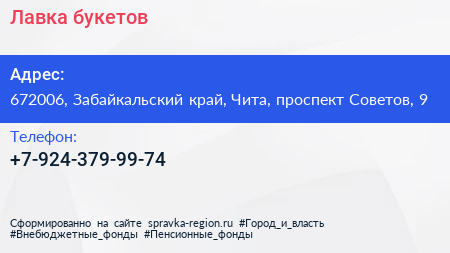 Лавка букетов по адресу 672006, Забайкальский край, Чита, проспект Советов, 9 в дальнейшем Организация, размещена в следующих категориях: