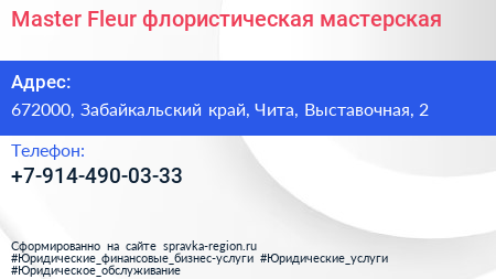 Master Fleur, флористическая мастерская по адресу 672000, Забайкальский край, Чита, Выставочная, 2 в дальнейшем Организация, размещена в следующих категориях: