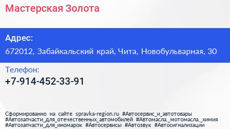 Мастерская Золота по адресу 672012, Забайкальский край, Чита, Новобульварная, 30 в дальнейшем Организация, размещена в следующих категориях: