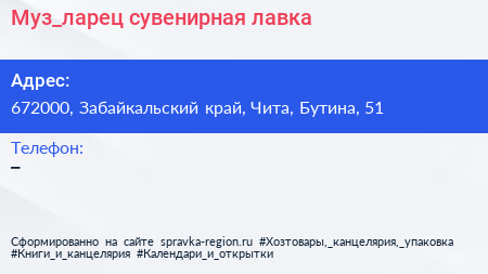 #Муз_ларец, сувенирная лавка по адресу 672000, Забайкальский край, Чита, Бутина, 51 в дальнейшем Организация, размещена в следующих категориях: