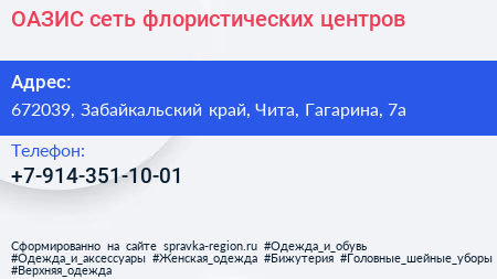 ОАЗИС, сеть флористических центров по адресу 672039, Забайкальский край, Чита, Гагарина, 7а в дальнейшем Организация, размещена в следующих категориях: