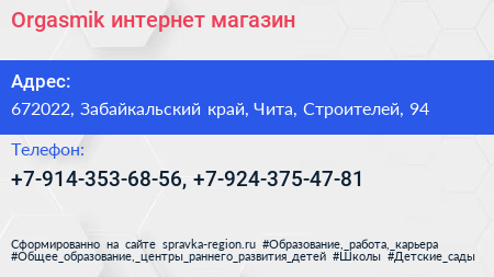 Orgasmik, интернет-магазин по адресу 672022, Забайкальский край, Чита, Строителей, 94 в дальнейшем Организация, размещена в следующих категориях: