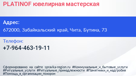PLATINOF, ювелирная мастерская по адресу 672000, Забайкальский край, Чита, Бутина, 73 в дальнейшем Организация, размещена в следующих категориях: