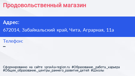 Продовольственный магазин по адресу 672014, Забайкальский край, Чита, Аграрная, 11а в дальнейшем Организация, размещена в следующих категориях: