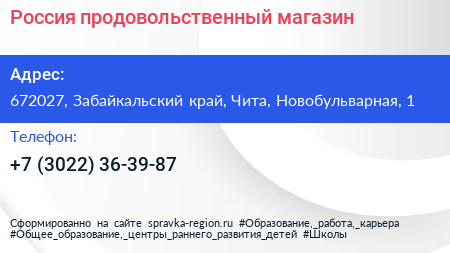 Россия, продовольственный магазин по адресу 672027, Забайкальский край, Чита, Новобульварная, 1 в дальнейшем Организация, размещена в следующих категориях: