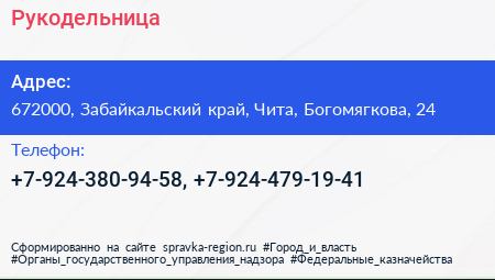 Рукодельница по адресу 672000, Забайкальский край, Чита, Богомягкова, 24 в дальнейшем Организация, размещена в следующих категориях: