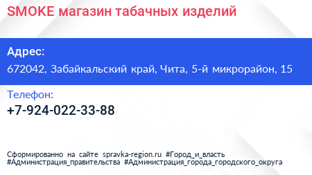 SMOKE, магазин табачных изделий по адресу 672042, Забайкальский край, Чита, 5-й микрорайон, 15 в дальнейшем Организация, размещена в следующих категориях: