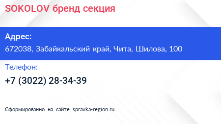 SOKOLOV, бренд-секция по адресу 672038, Забайкальский край, Чита, Шилова, 100 в дальнейшем Организация, размещена в следующих категориях: