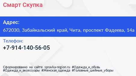 Смарт Скупка по адресу 672030, Забайкальский край, Чита, проспект Фадеева, 14а в дальнейшем Организация, размещена в следующих категориях: