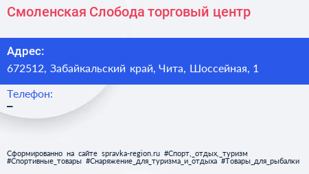 Смоленская Слобода, торговый центр по адресу 672512, Забайкальский край, Чита, Шоссейная, 1 в дальнейшем Организация, размещена в следующих категориях: