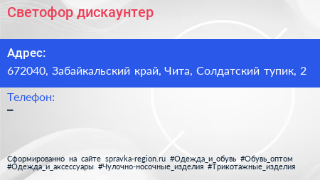 Светофор, дискаунтер по адресу 672040, Забайкальский край, Чита, Солдатский тупик, 2 в дальнейшем Организация, размещена в следующих категориях: