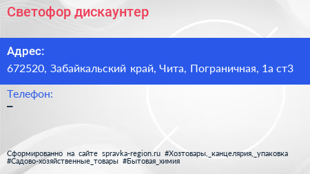 Светофор, дискаунтер по адресу 672520, Забайкальский край, Чита, Пограничная, 1а ст3 в дальнейшем Организация, размещена в следующих категориях: