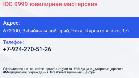ЮС 9999, ювелирная мастерская по адресу 672000, Забайкальский край, Чита, Курнатовского, 17г в дальнейшем Организация, размещена в следующих категориях: