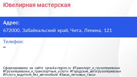 Ювелирная мастерская по адресу 672000, Забайкальский край, Чита, Ленина, 121 в дальнейшем Организация, размещена в следующих категориях: