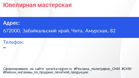 Ювелирная мастерская по адресу 672000, Забайкальский край, Чита, Амурская, 82 в дальнейшем Организация, размещена в следующих категориях: