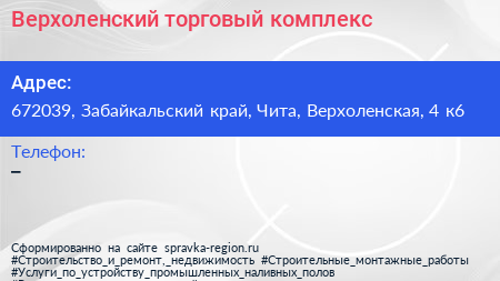 Верхоленский, торговый комплекс по адресу 672039, Забайкальский край, Чита, Верхоленская, 4 к6 в дальнейшем Организация, размещена в следующих категориях: