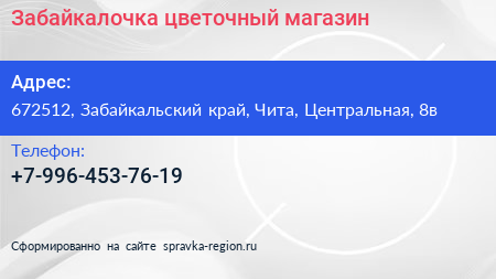 Забайкалочка, цветочный магазин по адресу 672512, Забайкальский край, Чита, Центральная, 8в в дальнейшем Организация, размещена в следующих категориях:
