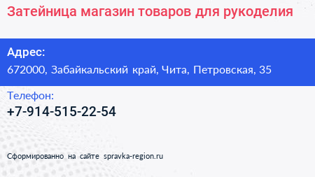 Затейница, магазин товаров для рукоделия по адресу 672000, Забайкальский край, Чита, Петровская, 35 в дальнейшем Организация, размещена в следующих категориях: