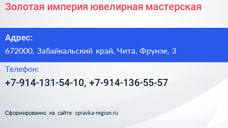 Золотая империя, ювелирная мастерская по адресу 672000, Забайкальский край, Чита, Фрунзе, 3 в дальнейшем Организация, размещена в следующих категориях: