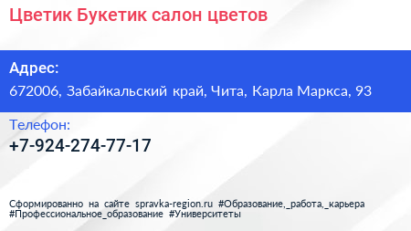 Цветик-Букетик, салон цветов по адресу 672006, Забайкальский край, Чита, Карла Маркса, 93 в дальнейшем Организация, размещена в следующих категориях: