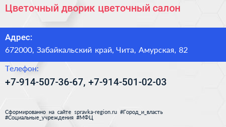 Цветочный дворик, цветочный салон по адресу 672000, Забайкальский край, Чита, Амурская, 82 в дальнейшем Организация, размещена в следующих категориях: