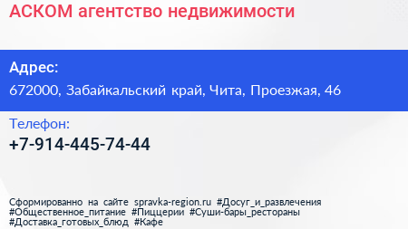 АСКОМ, агентство недвижимости по адресу 672000, Забайкальский край, Чита, Проезжая, 46 в дальнейшем Организация, размещена в следующих категориях: