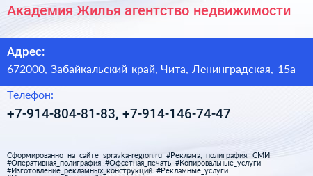 Академия Жилья, агентство недвижимости по адресу 672000, Забайкальский край, Чита, Ленинградская, 15а в дальнейшем Организация, размещена в следующих категориях: