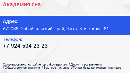 Академия сна по адресу 672038, Забайкальский край, Чита, Кочеткова, 81 в дальнейшем Организация, размещена в следующих категориях: