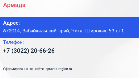 Армада по адресу 672014, Забайкальский край, Чита, Широкая, 53 ст1 в дальнейшем Организация, размещена в следующих категориях: