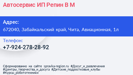 Автосервис, ИП Репин В.М. по адресу 672040, Забайкальский край, Чита, Авиационная, 1л в дальнейшем Организация, размещена в следующих категориях: