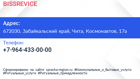 BISSREVICE по адресу 672030, Забайкальский край, Чита, Космонавтов, 17а в дальнейшем Организация, размещена в следующих категориях:
