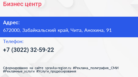 Бизнес-центр по адресу 672000, Забайкальский край, Чита, Анохина, 91 в дальнейшем Организация, размещена в следующих категориях: