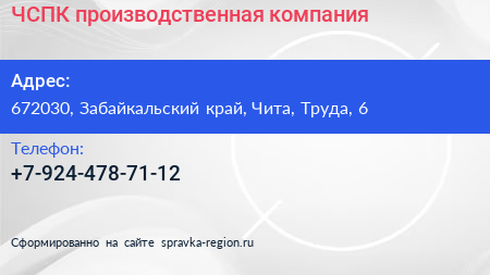 ЧСПК, производственная компания по адресу 672030, Забайкальский край, Чита, Труда, 6 в дальнейшем Организация, размещена в следующих категориях: