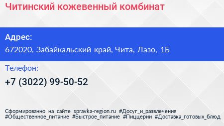Читинский кожевенный комбинат по адресу 672020, Забайкальский край, Чита, Лазо, 1Б в дальнейшем Организация, размещена в следующих категориях: