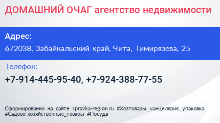 ДОМАШНИЙ ОЧАГ, агентство недвижимости по адресу 672038, Забайкальский край, Чита, Тимирязева, 25 в дальнейшем Организация, размещена в следующих категориях: