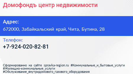 Домофондъ, центр недвижимости по адресу 672000, Забайкальский край, Чита, Бутина, 28 в дальнейшем Организация, размещена в следующих категориях: